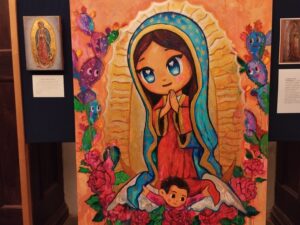 Madonna di Guadalupe (Simone Legno, 2025) con accanto una icona della Vergine Maria di Guadalupe opera di Nektaria Savioli (Arcidiocesi ortodossa d’Italia, parrocchia di Firenze) e realizzata secondo la tecnica tradizionale degli agiografi nei monasteri greci tra XIII e XV secolo.