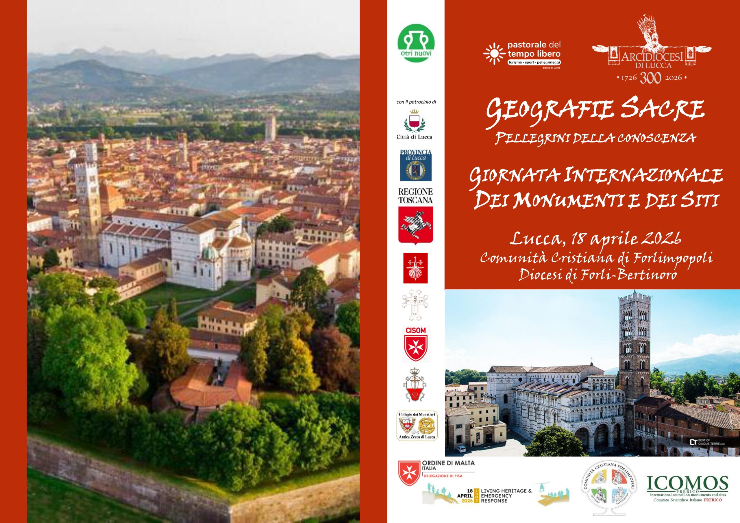 Il 18 aprile si celebra la Giornata Internazionale dei Monumenti e dei Siti, istituita da ICOMOS e riconosciuta dall’UNESCO, un appuntamento che invita le comunità di tutto il mondo a riflettere sul valore del patrimonio culturale nella sua dimensione più ampia e condivisa. In questa occasione, l’Arcidiocesi di Lucca in collaborazione con la presidenza di ICOMOS PRERICO, Patrimonio Religioso e Riti e con la Comunità Cristiana di Forlimpopoli (Diocesi di Forlì-Bertinoro) desiderano porre particolare attenzione al patrimonio culturale religioso, componente essenziale dell’identità storica, artistica e sociale dei territori in dialogo con il progetto diocesano “Geografie Sacre. Pellegrini della conoscenza”.